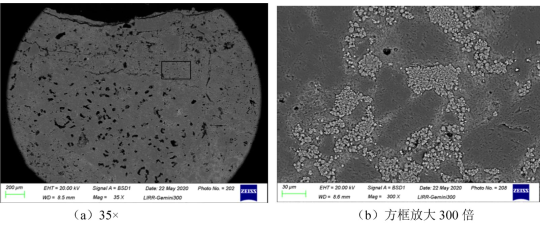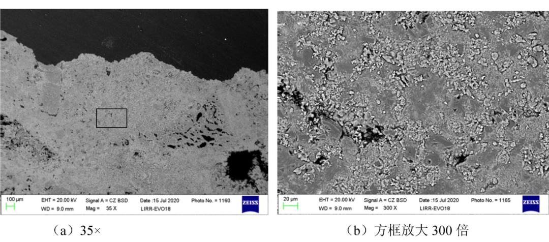 抗剝落高鋁磚JA堿侵蝕后坩堝底部0~10mm區(qū)域微觀結(jié)構(gòu)照片見圖5。從圖5(a)觀察發(fā)現(xiàn):坩堝底部表層結(jié)構(gòu)變得致密,礬土顆粒被侵蝕現(xiàn)象明顯,基質(zhì)中顆粒結(jié)構(gòu)變得不明顯。從圖5(b)觀察看出:基質(zhì)顆粒邊緣變得非常模糊,氣孔或晶界填充大量的淺顏色新相。抗剝落高鋁磚JA顯氣孔率高,碳酸鉀沿氣孔或晶界進入磚體侵蝕試樣內(nèi)部,侵蝕深度大。對侵蝕層進行物相分析,發(fā)現(xiàn)侵蝕層有鉀霞石生成(見圖6)。大量鉀霞石的生成造成體積膨脹,導(dǎo)致抗剝落高鋁磚產(chǎn)生大的貫穿裂紋。