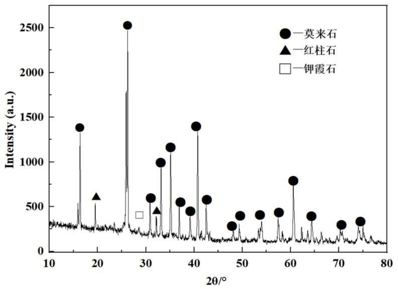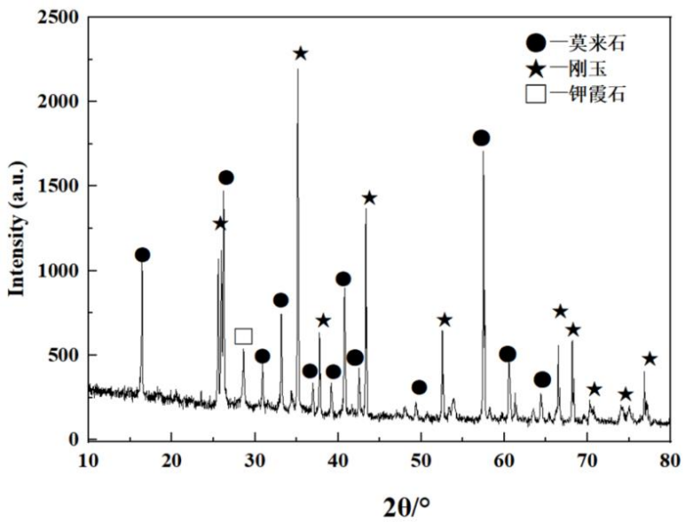低鋁莫來石磚M55堿侵蝕后坩堝底部0~10mm區(qū)域微觀結(jié)構(gòu)照片見圖7。從圖7(a)可以看出:低鋁莫來石磚M55坩堝底部表層結(jié)構(gòu)也產(chǎn)生少量的裂紋,結(jié)構(gòu)也變得致密,但與抗剝落高鋁磚差異較大。高倍下(見圖7(b))觀察,致密莫來石顆粒邊緣也產(chǎn)生較為明顯侵蝕,可見碳酸鉀對低鋁莫來石磚也形成一定侵蝕和滲透作用,但相對于抗剝落高鋁磚明顯改善。由衍射圖譜中(見圖8)可知:侵蝕層主要物相為莫來石和少量未發(fā)生轉(zhuǎn)化的紅柱石,同時也存在少量的鉀霞石。低鋁莫來石磚M55中采用的原料為莫來石均質(zhì)料和紅柱石為原料,莫來石均質(zhì)料結(jié)構(gòu)致密,含有一定量的高硅非晶相,高溫下鉀融入非晶相形成高黏度玻璃相;同時,紅柱石分解形成的非晶態(tài)SiO2吸收部分碳酸鉀也生成高黏度玻璃相,并由其封閉耐火磚侵蝕層,阻礙K元素的滲透。少量的碳酸鉀與莫來石反應(yīng)生成鉀霞石,鉀霞石的生成量低,產(chǎn)生的膨脹不足以破壞磚體結(jié)構(gòu),因此,低鋁莫來石磚M55表現(xiàn)出良好的抗堿侵蝕性能。