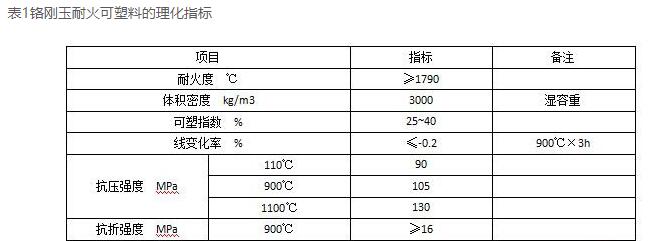 眾所周知,鉻剛玉是一種耐火原料,主要由氧化鉻和剛玉組成。鉻剛玉具有高熔點和硬度,在高溫下體積穩(wěn)定,不膨脹收縮,能很好地抵抗酸性和堿性氣體的侵蝕,不易與爐渣發(fā)生反應(yīng)。以鉻剛玉為基料生產(chǎn)的鉻剛玉耐火性高,耐磨性好,在高溫下耐酸堿侵蝕,可延緩襯里損壞,延長使用壽命。表1是鉻剛玉耐火塑料的物理化學(xué)指標。