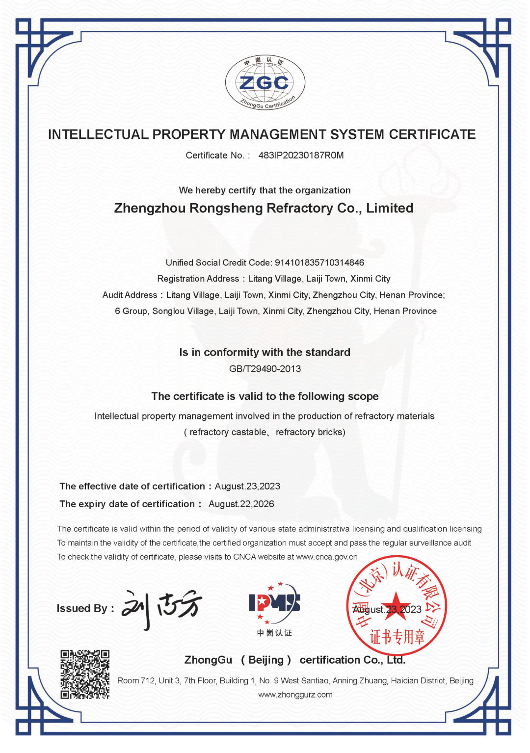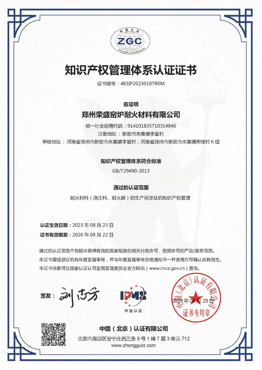 近日,鄭州榮盛窯爐耐火材料有限公司(以下簡稱「榮盛耐材」)順利通過國家知識產(chǎn)權(quán)貫標(biāo)認(rèn)證,并獲得了《知識產(chǎn)權(quán)管理體系認(rèn)證證書》中英文雙語認(rèn)證。該項認(rèn)證的順利通過,標(biāo)志著榮盛耐材構(gòu)建了一套規(guī)范化、系統(tǒng)化、程序化、精細(xì)化的知識產(chǎn)權(quán)管理體系。